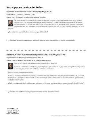 Puede invitar a algunos alumnos que así lo deseen a compartir su respuesta con la clase. Anime a los alumnos a llevar su volante a casa y hablar de lo que aprendieron con un familiar o amigo. Puede testificar del poder y la disposición del Señor de bendecirnos con lo que necesitamos para trabajar fielmente con Él en esta gran obra.