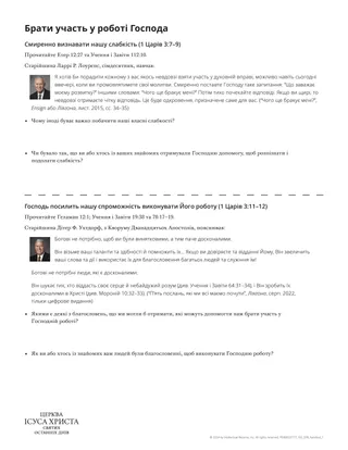 Ви можете допомогти студентам поглибити їхнє розуміння цієї істини. Один зі способів це зробити — скористатися роздатковим матеріалом “Брати участь у роботі Господа”. Ви можете розрізати роздатковий матеріал навпіл і запропонувати студентам вибрати частину, присвячену істині, про яку вони хотіли б дізнатися більше. Студенти можуть працювати індивідуально або у групах ще з двома чи трьома студентами, які вибрали ту саму частину.