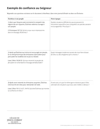 Utilisez le document à distribuer « Exemple de confiance au Seigneur » pour faire comprendre aux apprenants le principe qu’ils ont relevé plus tôt et leur montrer le lien entre Ézéchias et eux.