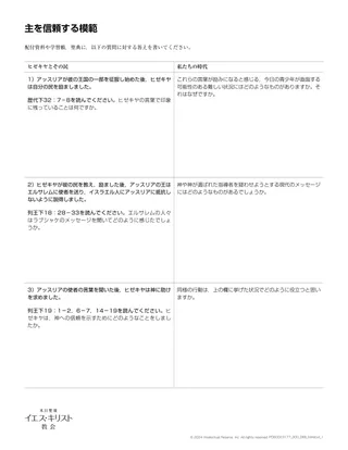 配付資料「主を信頼する模範」を使って,生徒が先ほど見つけた原則を理解し,ヒゼキヤと自分の生活を結びつけられるようにするとよいでしょう。