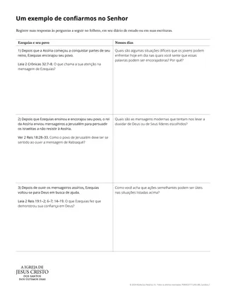 Pode ser útil usar o material complementar “Um exemplo de confiar no Senhor” para ajudar os alunos a entender o princípio que identificaram anteriormente e fazer conexões entre Ezequias e a vida deles.