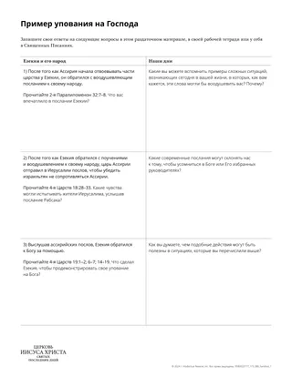 Вы можете использовать раздаточный материал «Пример того, как полагаться на Господа», чтобы помочь студентам понять принцип, который они выявили ранее, и провести параллель между Езекией и их жизнью.