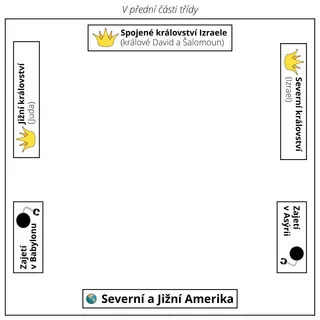 Před začátkem hodiny byste mohli označit různé oblasti ve třídě jako Severní království (Izrael), Jižní království (Juda), Assyrie, Amerika a Babylon/Persie.