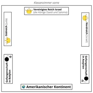 Kennzeichnen Sie vor dem Unterricht verschiedene Teile des Klassenraums als Nordreich (Israel), Südreich (Juda), Assyrien, Amerikanischer Kontinent und Babylon/Persien.
