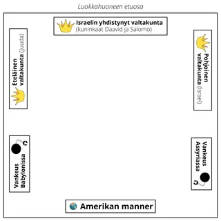Ennen oppituntia voisit merkitä luokkahuoneeseen viisi aluetta: Pohjoinen valtakunta (Israel), Eteläinen valtakunta (Juuda), Assyria, Amerikan manner ja Babylonia/Persia.