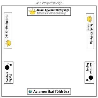 Az óra előtt kiteheted az osztályterem különböző területeire az északi királyság (Izráel), a déli királyság (Júda), az Asszíria, az amerikai földrész és a Babilon/Perzsia feliratokat.
