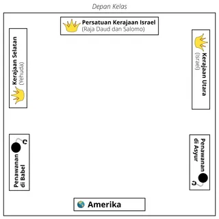 Sebelum kelas, Anda mungkin ingin memberi label tempat-tempat yang berbeda di kelas sebagai Kerajaan Utara (Israel), Kerajaan Selatan (Yehuda), Asyur, Benua Amerika, dan Babel/Persia.