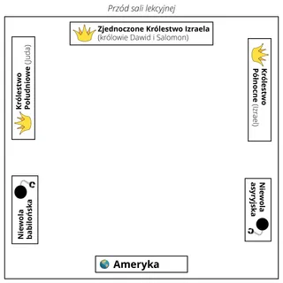 Przed lekcją możesz oznaczyć różne obszary w klasie jako Królestwo Północne (Izrael), Królestwo Południowe (Juda), Asyria, kontynenty amerykańskie i Babilon/Persja.
