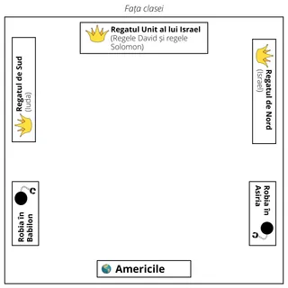 Înainte de începerea lecției, puteți eticheta diferite zone din clasă ca fiind Împărăția de Nord (Israel), Împărăția de Sud (Iuda), Asiria, meleagurile americane și Babilonul/Persia.