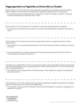 Ang kauban sa handout makatabang aron mapangita ang mas dakong kalabotan sa basahon sa Esdras diha sa ilang mga kinabuhi pinaagi sa pagtandi sa mga paningkamot sa mga Judeo nga tukoron ang templo ngadto sa atong mga pagpangandam sa pagsimba sa Ginoo diha sa Iyang mga templo.