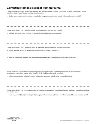 Kaasas olev jaotmaterjal võib aidata õpilastel paremini mõista, kuidas Esra raamat seostub nende eluga, võrreldes juutide jõupingutusi templi ehitamisel meie ettevalmistustega kummardada Issandat Tema templites.