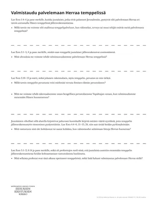 Se, miten hyvin valmistaudumme elämämme tärkeisiin tapahtumiin, voi vaikuttaa merkittävästi niistä saamaamme kokemukseen. Monet israelilaiset pystyivät kokemaan syvää iloa valmistauduttuaan vuosikausien ajan fyysisesti ja hengellisesti Jumalan temppelin jälleenrakentamiseen ja siellä palvelemiseen. Taivaallinen Isämme ja Vapahtajamme ovat siunanneet myös meitä mahdollisuuksilla kokea iloa palvelemalla Herran huoneessa. Se, miten pyrimme valmistautumaan tuohon siunaukseen, voi vaikuttaa kokemukseemme. Tämä oppiaihe voi auttaa oppilaita tuntemaan entistä suurempaa halua valmistautua palvelemaan Herraa Hänen pyhässä temppelissään.