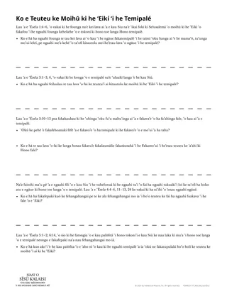 ʻI he hokohoko atu hono ako ʻe he kau akó e fakamatala ʻo e kakai ʻi he tohi ʻa ʻĒselá, fakaafeʻi kinautolu ke fakasio ha fakamoʻoni ʻo e foʻi moʻoni ko ʻení: ʻI heʻetau teuteu ke moihū ki he ʻEikí ʻi he temipalé, te Ne tāpuakiʻi kitautolu ʻaki ha fiefia ʻE lava ke ke hiki e foʻi moʻoni ko ʻení ʻi he palakipoé.