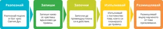Помислете за това, което сте били подтиквани от Светия Дух да правите през последните няколко седмици. Тези подтици може да са били получавани в най-различни ситуации, включително у дома, в църквата или в семинара. За всяка подкана, която разпознаете, помислете къде се намирате на следната диаграма. Запишете своите мисли в дневниците си за изучаване на Писанията, относно това какви според вас да са следващите ви стъпки, за да следвате подтиците, които сте получили.