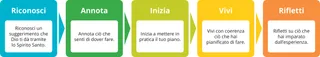 Pensate a ciò che avete sentito lo Spirito Santo suggerirvi di fare nelle ultime settimane. Potreste aver ricevuto questi suggerimenti in diversi contesti, tra cui a casa, in chiesa o al Seminario. Per ogni suggerimento che riconoscete, pensate a dove vi trovate in questo diagramma. Scrivete nel diario di studio quali pensate siano i prossimi passi che dovete fare per seguire i suggerimenti ricevuti.