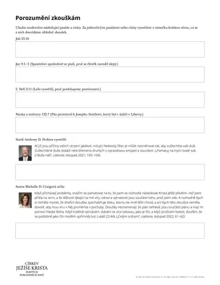 Příprava studentů: Položte studentům otázku: „Proč Bůh dopouští, abychom zažívali zkoušky?“ Vybídněte je, aby odpovědi hledali pomocí božsky určených zdrojů, jako jsou písma, učení církevních vedoucích nebo rodiče. Na odpověď by se také mohli zeptat členů rodiny nebo přátel.