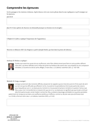Au lieu d’utiliser le document, demandez aux apprenants de rechercher des mots tels que « adversité » ou « épreuves » dans la Médiathèque de l’Évangile afin de relever des idées qui les aideront à mieux comprendre la raison d’être des épreuves.