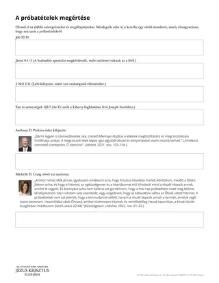 Adhatsz a tanulóknak A próbatételek megértése című kiosztmányból. A tanulók ezt egyedül is kitölthetik, hogy lehetőségük legyen a személyes elmélkedésre. Esetleg párokban vagy kis csoportokban is tanulmányozhatják a kiosztmányt, hogy jobban megértsék, vagy jobban bevonódjanak a tanulók.