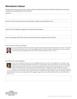 Pertimbangkan untuk menyediakan bagi siswa selebaran berjudul “Memahami Cobaan.” Siswa dapat menyelesaikan ini sendiri untuk memperkenankan perenungan pribadi. Atau mereka dapat menelaah selebaran tersebut secara berpasangan atau dalam kelompok-kelompok kecil untuk meningkatkan pemahaman atau keterlibatan siswa.