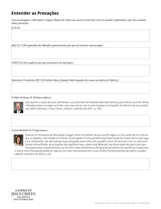 Você pode fornecer aos alunos o folheto intitulado “Entender as Provações”. Os alunos podem preenchê-lo por conta própria para possibilitar a reflexão pessoal. Ou então, podem estudar o material em duplas ou em pequenos grupos para aprimorar o conhecimento ou o envolvimento dos alunos.