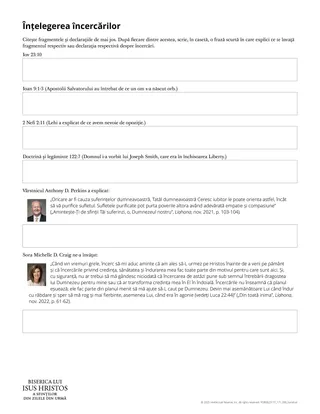 Studiul surselor desemnate de Divinitate poate invita Duhul Sfânt în procesul nostru de învățare. Fii atent la ceea ce te-ar putea învăța El în timp ce citești versetele și declarațiile din această lecție. Gândește-te la cum îi pot ajuta aceste învățături pe alții să găsească răspuns la întrebări legat de încercările lor. Acest lucru te poate ajuta să dobândești o înțelegere mai mare despre propriile încercări.