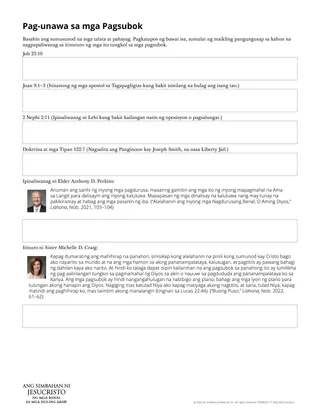 Maaari mong bigyan ang mga estudyante ng handout na may pamagat na “Pag-unawa sa mga Pagsubok.”Maaari itong gawin ng mga estudyante nang mag-isa upang mabigyang-daan ang personal na pagninilay.O maaari nilang pag-aralan ang handout nang magkakapartner o sa maliliit na grupo upang madagdagan ang pag-unawa o pakikilahok ng mga estudyante.