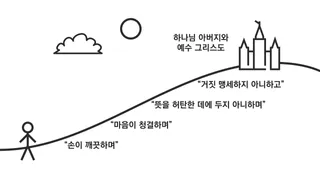 언덕 꼭대기에 간단한 성전 그림과 하나님 아버지와 예수 그리스도라는 단어를 적어 두어도 좋다. 언덕 아래에 우리를 나타내는 막대 모양 사람을 그릴 수 있다.