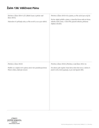 Mohli byste studenty vyzvat, aby si označili slova „nebo věčné jest milosrdenství jeho“. Mohli byste zdůraznit, že pokaždé, když žalmista oslavuje Boha, čímž vyjadřuje vděčnost, poukazuje na Boží lásku. Mohli byste vysvětlit, že v hebrejštině se v těchto verších pro milosrdenství používá slovo hesed, což je „výjimečný druh lásky a milosrdenství, které Bůh pociťuje a projevuje vůči těm, kteří s Ním uzavřeli smlouvu“ (Russell M. Nelson, „Věčná smlouva“, Liahona, říjen 2022, 6).