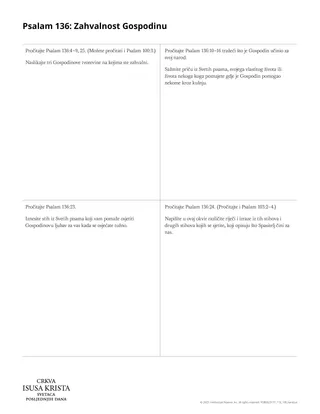 Možete pozvati polaznike da označe izraz »vječna je ljubav njegova«. Možete istaknuti da svaki put kada psalmist iskazuje zahvalnost, prepoznaje Božju ljubav. Možete objasniti da je na hebrejskom jeziku riječ za ljubav u ovim stihovima hesed, što je »posebna vrsta ljubavi i milosrđa koju Bog osjeća i pruža onima koji su sklopili savez s njim« (Russell M. Nelson, »Vječni savez«, Lijahona, listopad 2022., 6.).