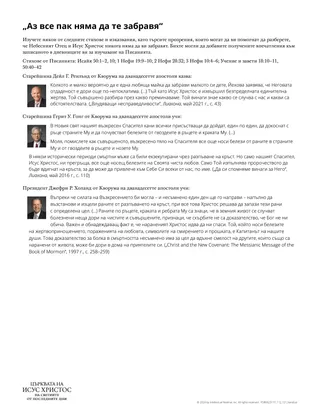 Когато учениците приключат с изучаването на материала за раздаване, желаещите биха могли да споделят какво са намерили за съдържателно в цитатите, стиховете от Писанията и личните прозрения.