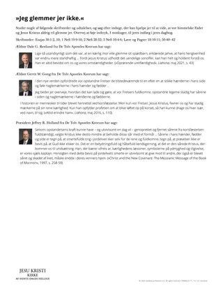 Her år senere kan jeg se tilbage på den unge dreng med ømhed og medfølelse. Og jeg ved nu, at jeg aldrig blev glemt. Og jeg ved også noget andet: Som en af Mesterens, Jesu Kristi apostle vil jeg med al vished og af hjertets fulde overbevisning erklære – det er I heller ikke! I er ikke glemt. (»Forglem mig ej«, Liahona, nov. 2011, s. 122)