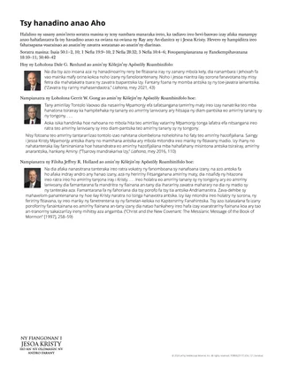 Taona maro aty aoriana dia afaka manao jery todika amim-pitiavana sy amim-pangorahana mikasika izany ankizilahy kely izany aho. Ary fantatro ankehitriny—fa tsy nohadinoina velively aho. Ary mahafantatra zavatra hafa koa aho: amin’ny maha-Apôstôlin’i Jesoa Kristy Tompo ahy dia manambara amim-pahatokian-tena sy amim-paharesen-dahatra ato am-poko aho—fa tsy misy nohadinoina koa ianareo! Tsy nohadinoina ianareo. (“Aza hadino aho”, Liahona, nôv. 2011, 122)