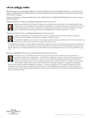 Спустя годы я могу взглянуть на того мальчугана с нежностью и сочувствием. И сегодня я твердо знаю: обо мне никогда не забывали. И я знаю что-то еще: как Апостол нашего Учителя, Иисуса Христа, я заявляю со всей уверенностью и убежденностью своего сердца: о вас тоже. О нас не забыли. («Не забудь меня», Лиахона, ноябрь 2011 г., стр. 122)