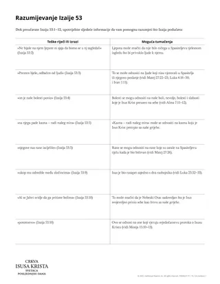 Polaznici mogu primiti utjehu i produbiti svoj odnos s Nebeskim Ocem i Isusom Kristom kroz osobno proučavanje Izaije 53. Sljedeća je aktivnost jedan način na koji možete zatražiti od polaznika da prouče Izaiju 53.