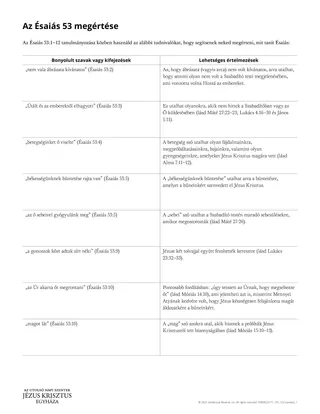 Az Ésaiás 53-ban néhány szót és kifejezést nehéz lehet megérteniük a tanulóknak. Ebben az esetben kiteheted a mellékelt Az Ésaiás 53 megértése című kiosztmányt, vagy kioszthatod a tanulóknak, hogy a tanulmányozásuk során használni tudják. Másik lehetőségként megkérheted a tanulókat, hogy a lábjegyzetek vagy egy szótár segítségével tisztázzák az ismeretlen szavakat vagy kifejezéseket.