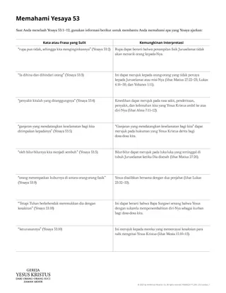 Beberapa kata dan frasa dalam Yesaya 53 mungkin sulit dipahami siswa. Jika demikian, Anda mungkin ingin memeragakan selebaran penyerta berjudul “Memahami Yesaya 53” atau menyediakannya untuk siswa rujuk sewaktu mereka menelaah. Sebagai alternatif, Anda dapat mengajak siswa untuk menggunakan catatan kaki atau kamus untuk mengklarifikasi kata atau frasa yang tidak familier.
