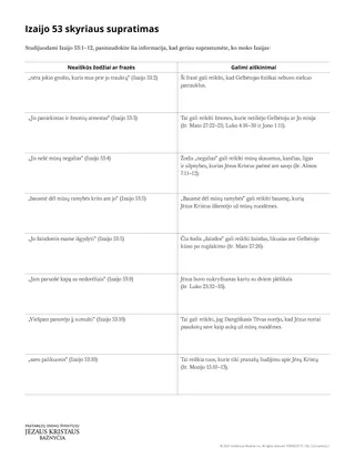 Kai kuriuos Izaijo 53 skyriuje esančius žodžius ir frazes mokiniams gali būti sunku suprasti. Jei taip, galite parodyti pridedamą dalijamąją medžiagą „Kaip suprasti Izaijo 53“ arba pateikti ją mokiniams, kad jie galėtų ja remtis studijuodami. Arba galite paprašyti mokinių naudotis išnašomis ar žodynu, kad išsiaiškintų nežinomus žodžius ar frazes.