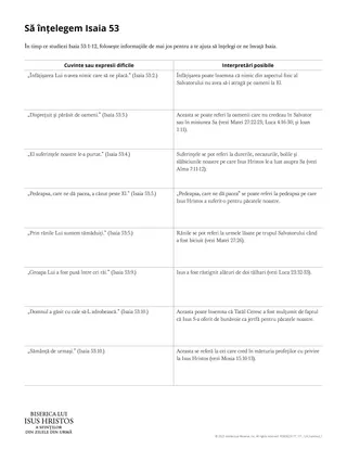 Unele dintre cuvintele și expresiile din Isaia 53 pot fi greu de înțeles pentru cursanți. În acest caz, puteți expune foaia de prezentare, intitulată „Să înțelegem Isaia 53”, sau o puteți oferi cursanților pentru a o consulta în timp ce studiază. Ca alternativă, puteți invita cursanții să folosească notele de subsol sau un dicționar pentru a clarifica cuvinte sau expresii necunoscute.