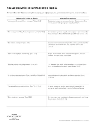 Деякі слова і фрази в Ісая 53 можуть бути складними для розуміння студентів. Якщо це так, ви можете показати супровідний роздатковий матеріал “Розуміння Ісаї 53” або надати його студентам для користування під час навчання. Або ж ви можете запропонувати студентам звертатися до виносок чи до словника, щоб з’ясувати значення незнайомих слів і фраз.