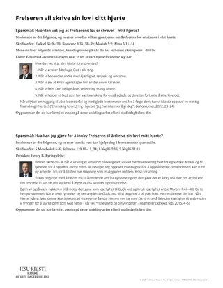 Hvordan kan noen handle hvis de har en teoretisk forståelse av Jesu Kristi evangelium, men ikke føler det i sitt hjerte? Er det mulig at man vil handle uten å føle kraften i Frelserens kjærlighet? Hvordan forandrer våre handlinger seg når vi føler vår himmelske Faders og Jesu Kristi kjærlighet i vårt hjerte? Jeremia 31 lover oss at når vi vender oss til Herren, vil han skrive sin lov i vårt hjerte (se Jeremia 31:18, 33). Denne leksjonen kan hjelpe elevene å forstå hva det vil si å ha Frelserens evangelium skrevet i sitt hjerte.