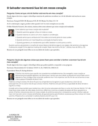 Você também pode pedir aos alunos que compartilhem experiências que tiveram ao reconhecer que o Salvador escreveu Sua lei em seu coração. Você pode contar como viu o Senhor escrever Sua lei em seu coração. Incentive os alunos a pedir ajuda ao Senhor e a agir de acordo com as impressões que receberem.