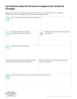 Pour aider les apprenants à s’entraîner à relever des principes de l’Évangile dans des histoires tirées des Écritures, utilisez le document à distribuer « Les histoires tirées des Écritures enseignent des vérités de l’Évangile ». Étant donné qu’ils présenteront ce qu’ils ont appris à la classe, il serait préférable qu’ils travaillent en binômes ou en petits groupes. Essayez de mettre les apprenants qui sont plus anxieux à l’idée de prendre la parole avec ceux qui se sentent plus à l’aise.