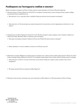 За да помогнете на учениците да разберат любовта и милостта на Господ към тях, може да използвате материала за раздаване „Разбиране на Господната любов и милост“. Учениците може да работят самостоятелно, за да се насърчи тихия, изпълнен с молитва размисъл, или да работят по групи с определен ръководител на групата, който да води обсъждането им. Докато учениците работят, обикаляйте из стаята и отговаряйте на въпросите им, ако е необходимо.