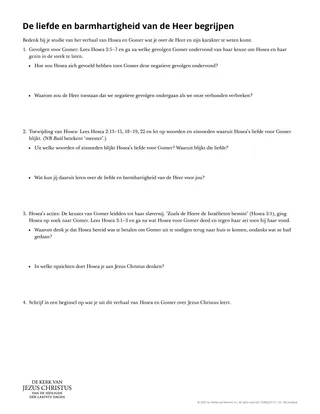 In het boek Hosea gebruikte de Heer het huwelijk van Hosea en Gomer als symbool om Israël over zijn oneindige verbondsliefde te leren. Net als Israël dwalen wij soms van de Heer en onze verbonden met Hem af. Toch blijft Jezus Christus getrouw en houdt Hij van ons. Deze les kan de cursisten de oneindige liefde en barmhartigheid van de Heer voor hen bijbrengen.
