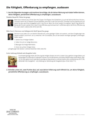 Um den Schülern zu verdeutlichen, wie man „die geistige Arbeit leistet“, die notwendig ist, um persönliche Offenbarung zu empfangen, teilen Sie das Arbeitsblatt „Die Fähigkeit, Offenbarung zu empfangen, ausbauen“ aus.