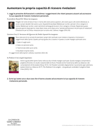 Per aiutare gli studenti a imparare come “compiere il lavoro spirituale” necessario per ricevere la rivelazione personale, dai a ciascuno di loro una copia della scheda: “Aumentare la propria capacità di ricevere rivelazione”.