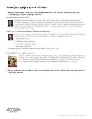 Mani mīļotie brāļi un māsas, es dedzīgi lūdzu, lai jūs vairotu savu garīgo atklāsmju saņemšanas spēju. … Izvēlieties pielikt garīgās pūles, paveicot to, kas tiek prasīts, lai varētu baudīt Svētā Gara dāvanu un daudz biežāk un skaidrāk sadzirdēt Gara balsi. „Atklāsme Baznīcai, atklāsme mūsu dzīvei” (vispārējās konferences runa), Liahona, 2018. g. maijs, 96. lpp.)