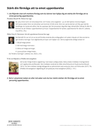 För att hjälpa eleverna lära sig hur de ska ”utföra det andliga arbete” som krävs för att kunna ta emot personlig uppenbarelse kan du ge var och en av dem ett exemplar av utdelningsbladet ”Stärk din förmåga att ta emot uppenbarelse”.