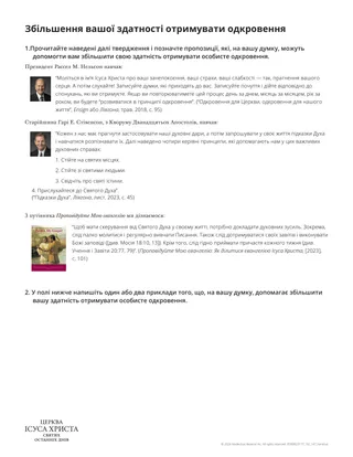 Щоб допомогти студентам навчитися “виконувати духовну роботу”, необхідну для отримання особистого одкровення, ви можете роздати кожному з них копію роздаткового матеріалу “Збільшення вашої здатності отримувати одкровення”.
