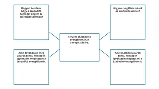 Miután elég időt hagytál nekik, kérj meg néhány készséges tanulót, hogy beszéljék meg a tapasztalataikat az osztállyal. Keresd a módját, hogy megdicsérd és biztasd a tanulókat a Szabadító evangéliuma megosztására irányuló erőfeszítéseikben. Lehetőséget is adhatsz a tanulóknak arra, hogy imádságosan új tervet készítsenek arra, milyen módokon osszák meg Jézus Krisztus evangéliumát a környezetükkel.